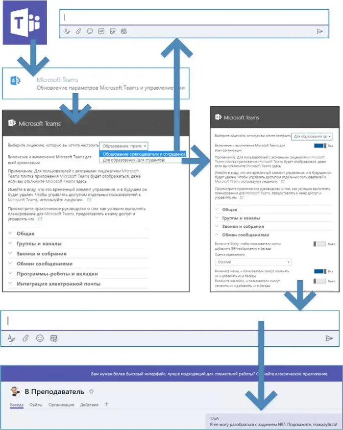 Настройка ролей находится в консоли администратора Office 365: «Admin center, Службы и надстройки, Microsoft Teams». Там задаётся роль «студент». Типичный пример ограничений для учебной среды: студентам отключают наклейки и GIF-эмотиконы. Не из педантизма, а чтобы не рассеивать внимание во время занятия.