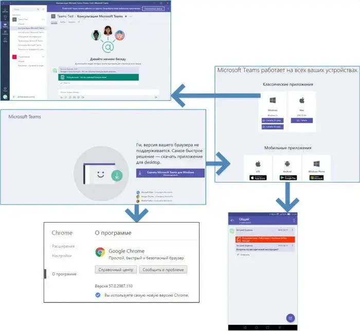 При первом входе через браузер система может предложить обновить его до актуальной версии или перейти на приложение. Это не обязательное требование, просто рекомендация. О системных требованиях и совместимости браузеров подробно написано в технической документации Microsoft Teams.