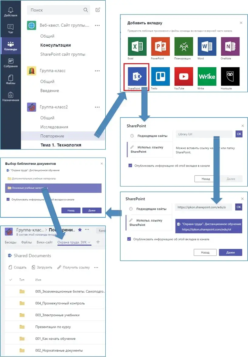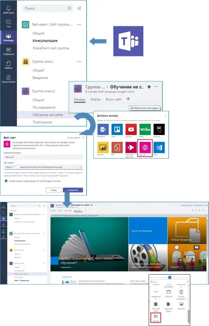 Целый сайт SharePoint подключается к каналу Teams через вкладку «Веб-сайт» – это даёт доступ ко всем библиотекам, спискам и веб-частям сайта сразу, без выбора отдельной библиотеки. Подходит, когда учебный контент организован на уровне всего сайта.